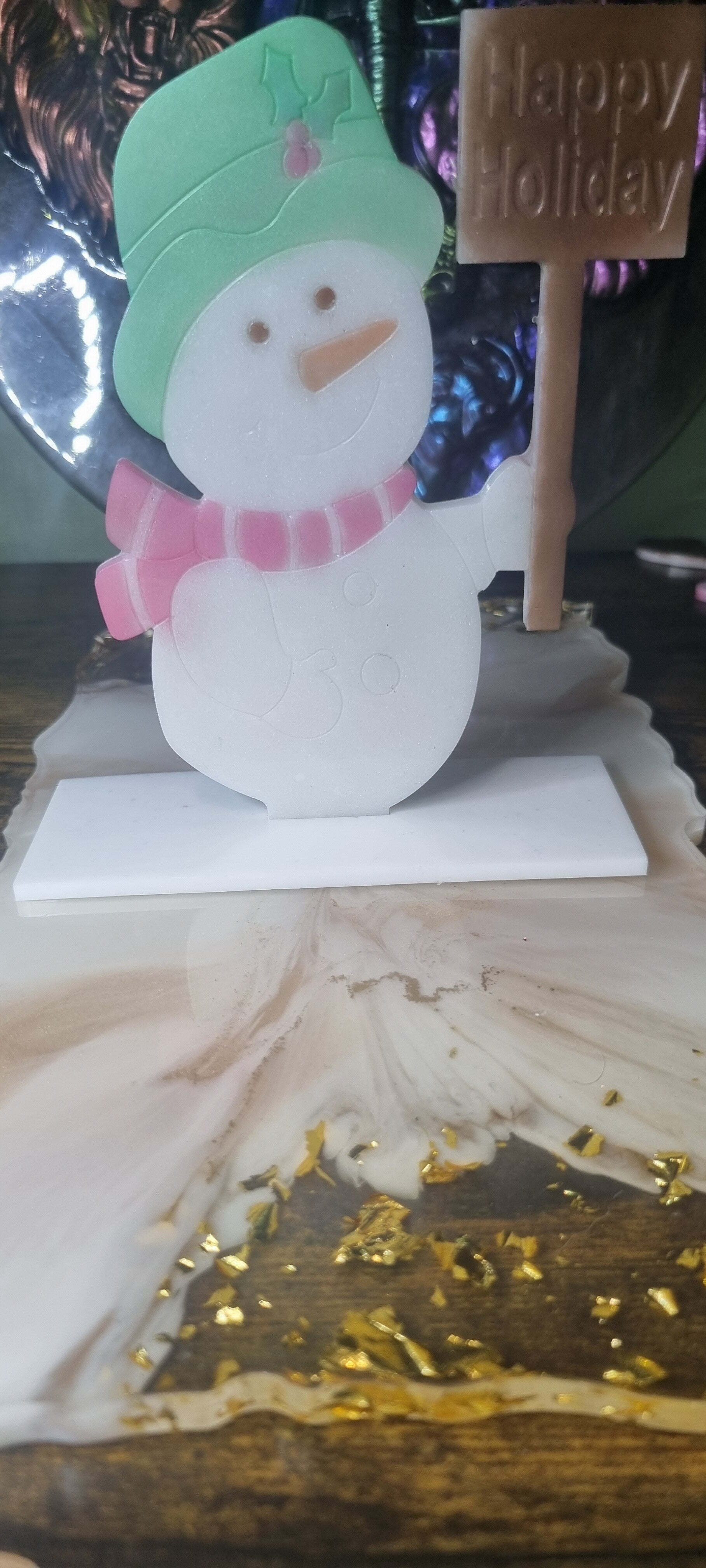 Bonhomme de neige sur socle, les couleurs sont un peu pâle.